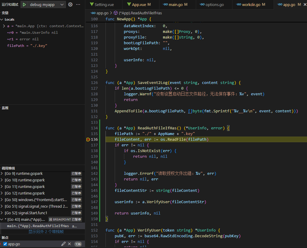 先在代码编辑器里,对想要调试的位置打一个断点。然后在vscode的运行和调试面板中,运行我们配置好的 debug myapp 就可以开始调试啦。